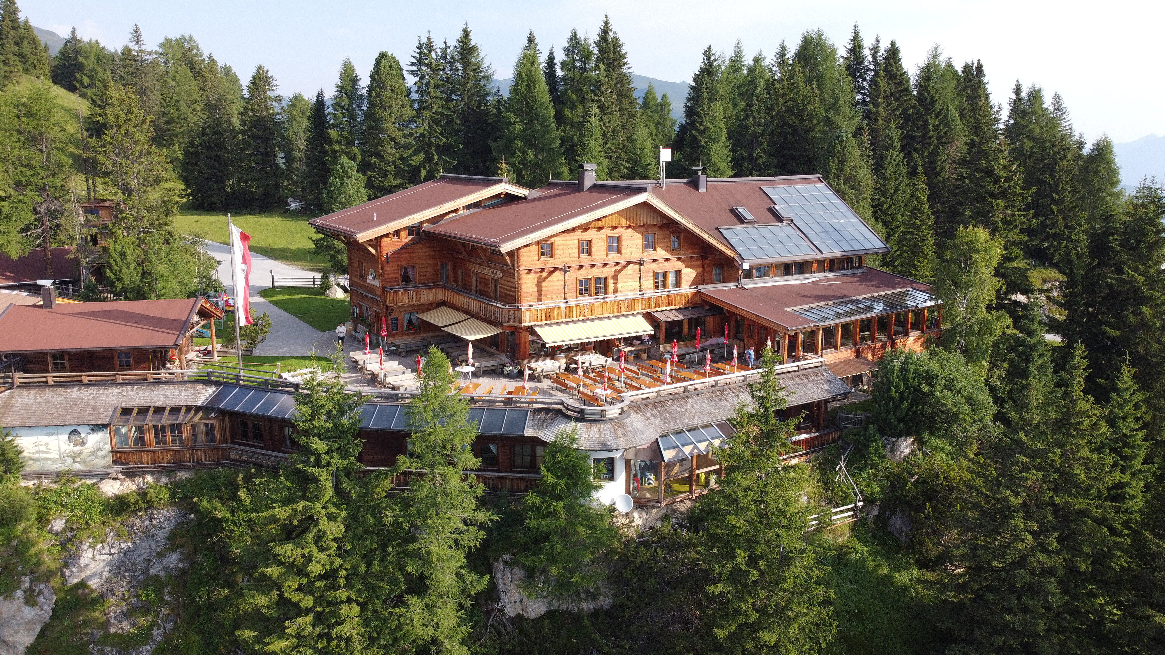 im Sommer: Berggasthof im Sommer mit Kinderwagen (10 Minuten Gehzeit) und Rollstuhl erreichbar, behindertengereches WC, E-Bike-Ladestation (Bosch).