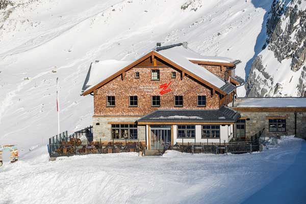 Bedienrestaurant mit Panorama-Sonnenterrasse, erreichbar zu Fuß und mit den Skiern.